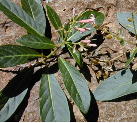 Cây canhkina là các cây thân gỗ cao, từ 10 – 25 m. Lá mọc đối, cuống có 2 lá kèm thường rụng sớm. Phiến lá hình trứng hoặc hình mác, nguyên; gân lá hình lông chim. Lá màu xanh lục hoặc đỏ nhạt.
