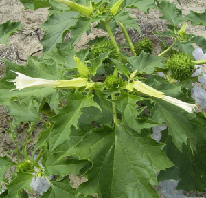 Datura metel L. Forma alba: hoa trắng, thân và cành đều xanh.