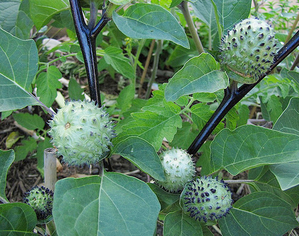 Quả cà độc dược hình cầu, có gai. Lúc non có màu xanh, về già chuyển sang màu nâu, bên trong có chứa các hạt dẹt, cạnh có vân nổi.