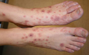 - Da dày lên, thâm, ranh giới không rõ ràng, có các vết nứt gây đau, nguyên nhân do bệnh nhân gãi nhiều
